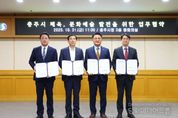 시민행정신문 강갑수 기자 | 충주시는 31일 시청 중회의실에서 2027년 하계세계대학경기대회의 성공적인 개최와 문화예술 발전을 위해 국립한국교통대학교, 건국대학교 글로컬캠퍼스, 충주시체육회와 공식 업무협약을 체결했다. 이번 협약은 지역 주요 체육관과 충주문화회관의 리모델링 공사로 경기장과 문화시설 활용이 일시적으로 제한됨에 따라, 지역 대학교 시설을 비롯한 각종 지원 협력을 공식화하기 위해 마련됐다. 협약식에는 조길형 충주시장, 윤승조 국립한국교통대학교 총장, 최영근 건국대학교 글로컬캠퍼스 부총장, 진용섭 충주시체육회장 등이 참석해 전문체육 및 생활체육 활성화, 문화예술 발전 등을 위한 협력 강화, 협약 기관 간 인적 인프라 지원 등 다양한 분야에서 협력하기로 뜻을 모았다. 협약을 통해 각 기관의 체육관 등 시설 대관 시 적극적인 협조를 받고, 주요 행사 진행 시 기관 간 자원봉사 등 인프라 지원이 이뤄질 것으로 기대된다. 조길형 시장은 “2027년 U대회 성공 개최와 문화예술 발전을 위해 모두가 한 데 힘을 모으는 좋은 계기가 마련됐다”라며, “이번 U대회는 대학생들과 지역사회 모두가 어우러져 함