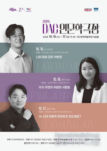 시민행정신문 기자 | (재)대구문화예술진흥원 문화예술회관은 인문학으로 시민들의 문화적 정서 함양과 인간다운 삶의 가치를 제공하기 위한 공개 강연인 2025 DAC 인문학극장을 오는 10월 15일부터 17일까지 오후 7시 30분 3일간 대구문화예술회관 비슬홀에서 개최한다.