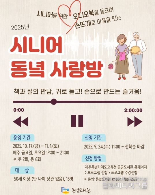 이번 프로그램은 동녘도서관 평생교육실에서 매주 금요일과 토요일 오후 7시부터 9시까지 총 6회 걸쳐 사서가 선정한 오디오북을 함께 들으며 뜨개질을 배우는 독창적인 방식으로 진행된다.