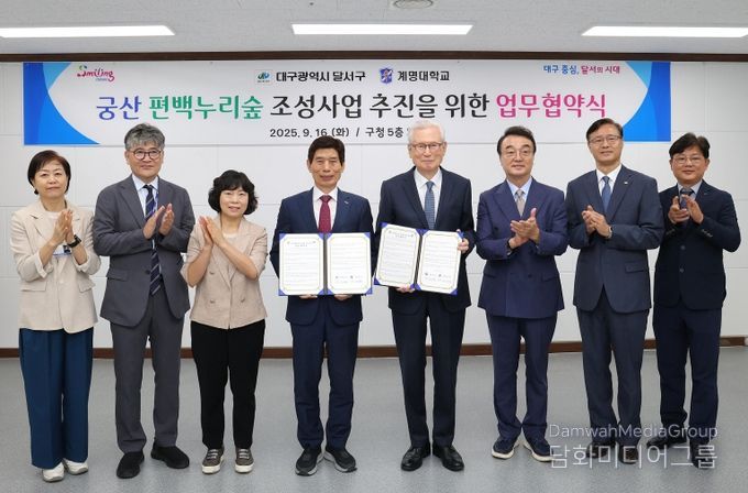 이태훈 달서구청장은 “협약을 통해 궁산 편백누리숲 조성사업이 속도감 있게 추진될 수 있도록 협조해 준 계명대학교에 감사드린다”며 “도시숲 조성을 지속 확대해 구민의 정주여건과 휴식의 품질을 높이겠다”고 말했다.