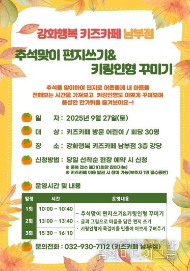 시민행정신문 강갑수 기자 | 강화군시설관리공단(이사장 박영길) 강화행복 키즈카페 남부점에서 오는 27일, 추석을 맞아 ‘추석맞이 편지쓰기&키링인형 꾸미기’ 프로그램을 운영한다.