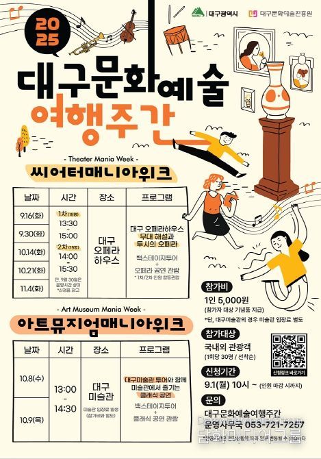 대구문화예술여행주간은 총 2가지 프로그램으로 국내유일의 제작극장인 대구오페라하우스에서 진행하는 씨어터매니아위크와 대구미술관에서 진행하는 아트뮤지엄매니아위크로 구성돼 있다.