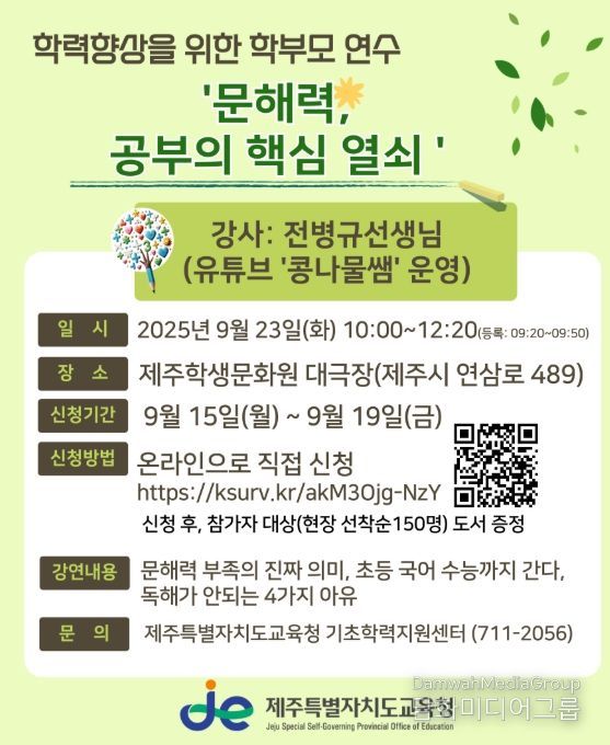 이번 강연은 이 시대에 꼭 필요한 문해력 향상 방법과 효과적인 교육 방법을 보호자에게 안내하는 자리로 오는 26일까지 온라인을 통해 사전 신청 후 참여할 수 있다.