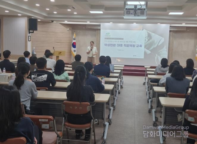 교육은 폭언·폭행 등 목적이 정당하지 않은 악성민원으로부터 민원업무 담당자를 보호하고 지원에 도움이 되고자 ▶악성민원인 응대원칙 ▶사례별 민원 분석 및 대응요령 ▶감정대립 예방법 ▶ 화난 민원인 대처 ▶거절 대응 사례 실습 내용으로 구성됐다.