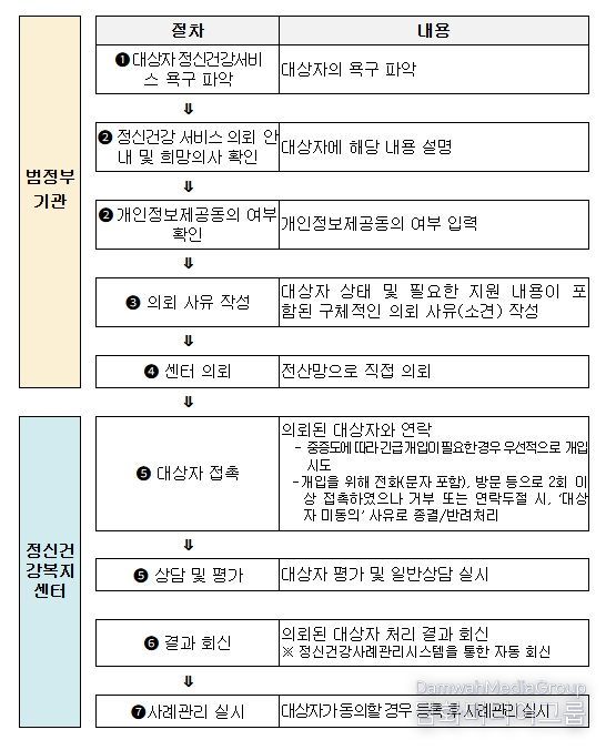 ‘범정부 서비스 의뢰’는 사회보장정보시스템을 기반으로 부처·지자체·민간시설 간 복지서비스를 상호 의뢰할 수 있는 체계다. 정신건강복지센터는 2024년 11월 병무청을 시작으로 서민금융진흥원, 신용회복위원회 등과의 연계를 확대해 왔다.