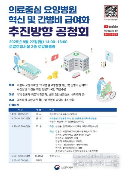 시민행정신문 이존영 기자 | 보건복지부는 9월 22일 14시, 로얄호텔서울 로얄볼룸홀(서울 중구 소재)에서‘의료중심 요양병원 혁신 및 간병 급여화’ 공청회를 개최했다.