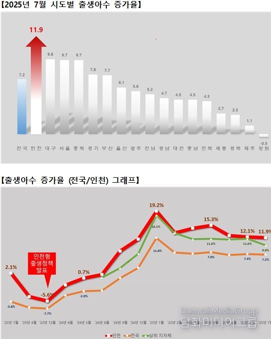 시민행정신문 강갑수 기자 | 인천광역시는 2025년 7월 출생아 수 증가율이 전년 동기 누계 대비 11.9%를 기록하며 다시 한번 전국 1위를 차지했다고 밝혔다.