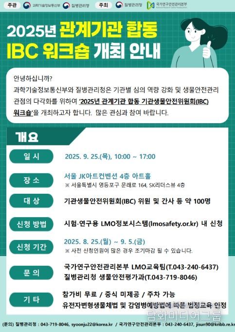 시민행정신문 이존영 기자 | 질병관리청은 유전자변형생물체 및 고위험병원체를 취급하는 기관의 자율적 생물안전 역량 강화를 위해 9월 25일 서울 JK아트컨벤션(서울 영등포구 소재)에서 '2025년 관계기관 합동 기관생물안전위원회 워크숍'을 개최한다고 밝혔다.