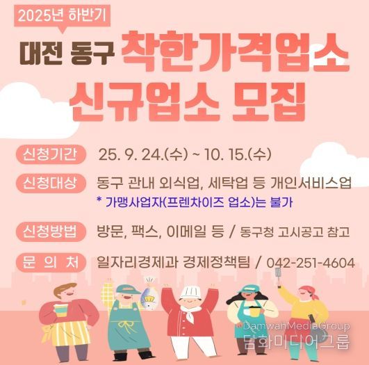 시민행정신문 강갑수 기자 | 대전 동구는 지역 내 물가 안정과 건전한 소비문화 확산을 위해 2025년 하반기 ‘착한가격업소’ 일제 정비와 신규 업소 모집을 실시한다고 25일 밝혔다.
