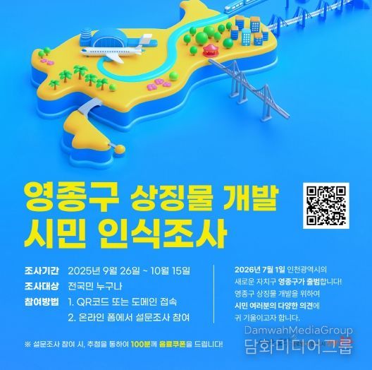 조사 내용으로는 ▲영종구를 대표하는 키워드 ▲영종구의 도시이미지 ▲영종구를 상징하는 캐릭터 소재가 포함돼 있다. 조사 결과는 상징물 개발의 방향성을 설정하는 데 중요한 기초자료로 활용될 예정이다.