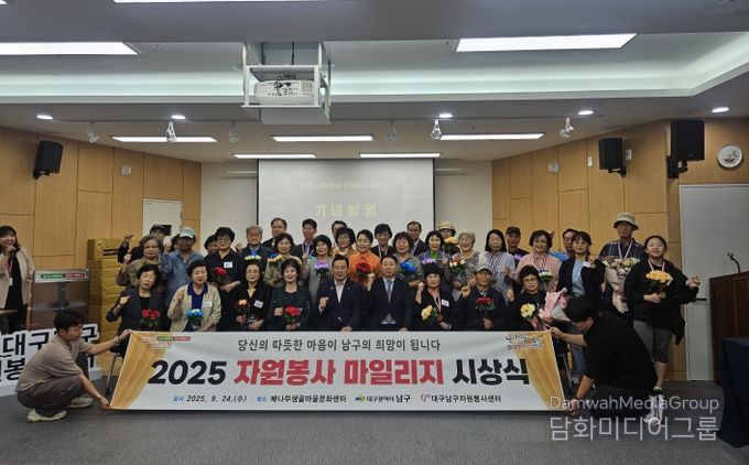 시민행정신문 강갑수 기자 | 대구 남구는 대구 남구자원봉사센터(센터장 이창지)와 함께 지난 9월 24일, '2025 자원봉사 마일리지 시상식'을 열고 한 해와 오랜 세월 동안 지역사회를 위해 헌신해 온 우수 자원봉사자들에게 인증메달, 공로패, 핸드프린팅을 수여했다.