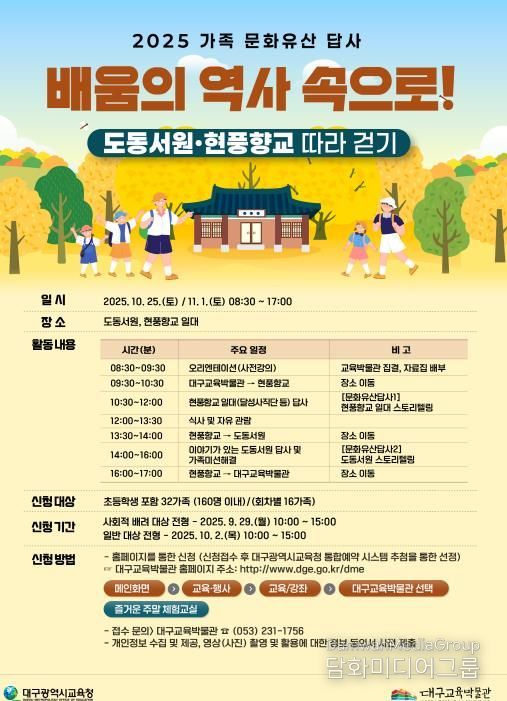 9월 29일부터 대구교육박물관 누리집을 통해 회차별 16가족을 모집하며, 기타 궁금한 사항은 교육학예부로 문의하면 된다.