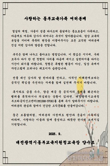시민행정신문 기자 | 대전동·서부교육지원청은 추석 명절을 맞이하여 청렴 실천의지를 담은 교육장 서한문을 관내 유·초·중학교 및 교육지원청 교직원들에게 발송하고 안내했다.