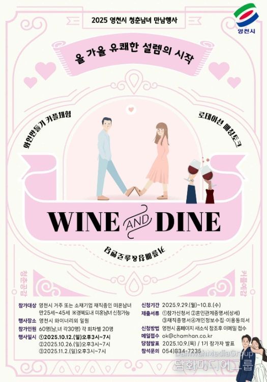 시민행정신문 강갑수 기자 | 영천시는 오는 10월 12일, 10월 26일, 11월 2일 세 차례에 걸쳐 관내 와이너리에서 미혼남녀를 위한 특별한 만남 프로그램 ‘2025 영천愛 와인·다인(wine·dine)’을 개최한다.
