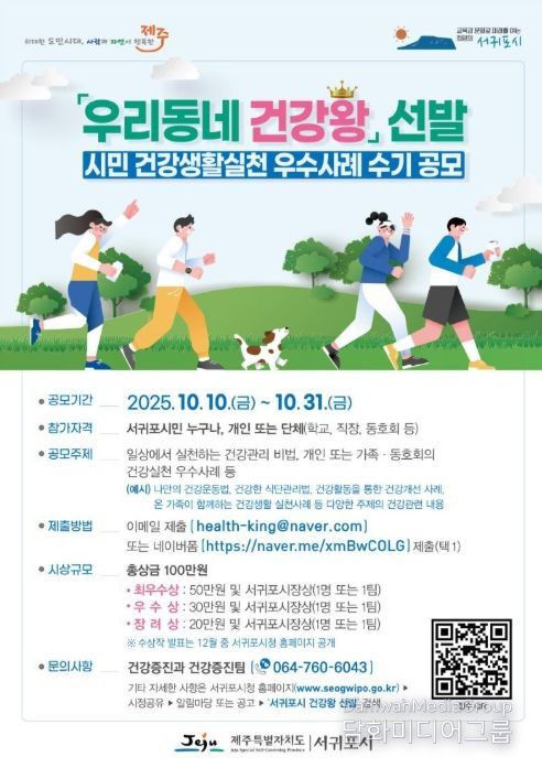 서귀포시 관계자는 “이번 공모를 통해 다양한 분야의 건강생활 우수사례를 시민들과 함께 공유하고 일상 속 건강생활 실천 운동에 모두가 동참해 주시길 바란다.”고 말했다.