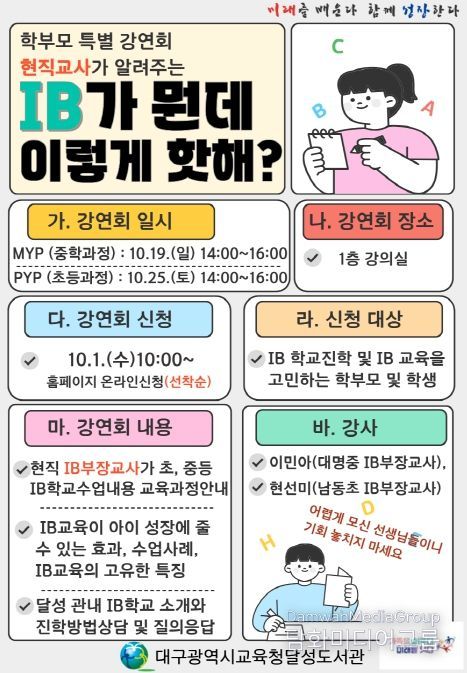 시민행정신문 기자 | 대구달성도서관은 10월 19일과 25일 양일간 학부모와 학생을 대상으로 ‘현직교사가 알려주는 IB가 뭔데 이렇게 핫해?’특별강연을 개최한다.