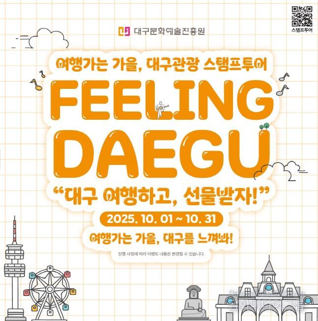 시민행정신문 강갑수 기자 | 대구광역시와 대구문예술진흥원관광본부는 문화체육관광부 ‘여행가는 가을’ 캠페인을 연계하여 10월 한 달간 대구를 방문하는 관광객 대상으로 스탬프투어 이벤트를 운영한다.