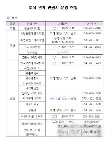 주요 관광지 휴무 및 운영 현황을 살펴보면 ▲국립울진해양과학관과 성류굴, 왕피천공원 내 시설물은 추석 당일인 10월 6일 휴관하며, ▲죽변해안스카이레일, 왕피천케이블카, 아쿠아리움은 연휴 기간 내내 정상 운영된다.