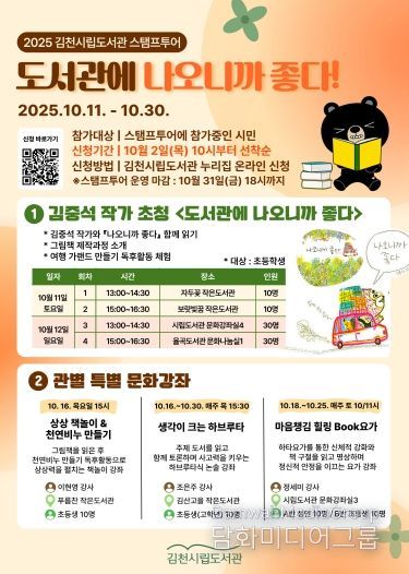 이번 프로그램은 김천시립도서관 본관을 비롯해 율곡도서관, 자두꽃·보랏빛꿈·푸름찬·김산고을 작은도서관 등 관내 6개 도서관에서 진행된다.