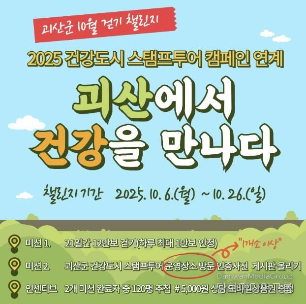 시민행정신문 기자 | 충북 괴산군보건소는 한국건강증진개발원이 주관하는 ‘2025 건강도시 스탬프투어 캠페인’과 연계해 ‘괴산에서 건강을 만나다’ 걷기 챌린지를 운영한다고 2일 밝혔다.