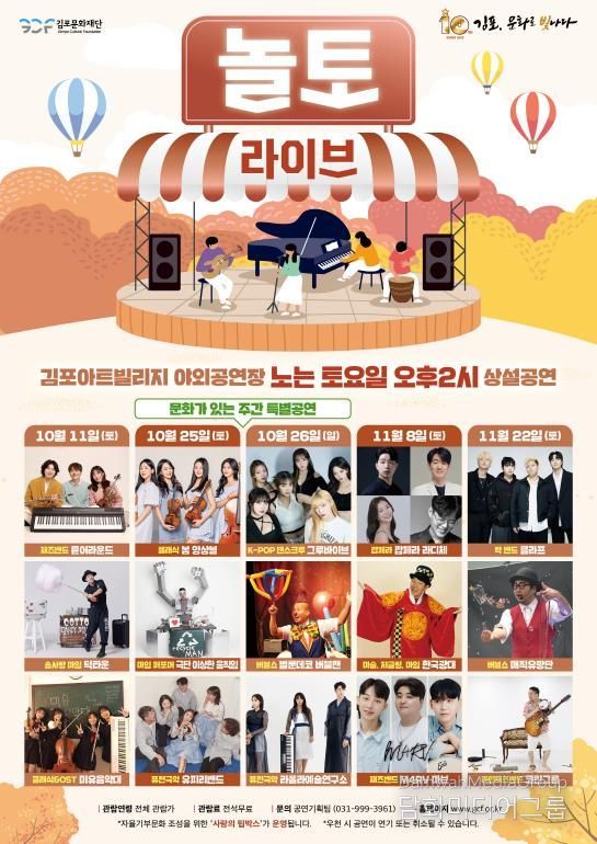 시민행정신문 기자 | (재)김포문화재단은 10월 11일부터 11월 22일까지 매월 둘째, 넷째 주 토요일마다 김포아트빌리지 야외공연장에서 하반기 토요상설공연 '놀토 라이브'를 개최한다고 밝혔다.