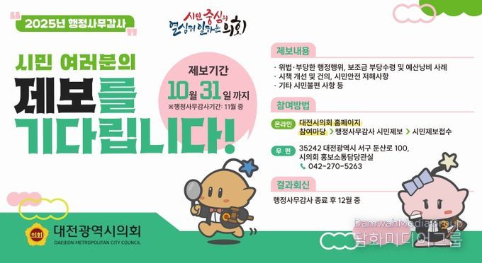 시민행정신문 기자 | 대전시의회는 2025년도 행정사무감사를 앞두고 내실있는 감사를 실시하기 위해 오는 10월 31일까지 다양한 시민 제보를 받는다.
