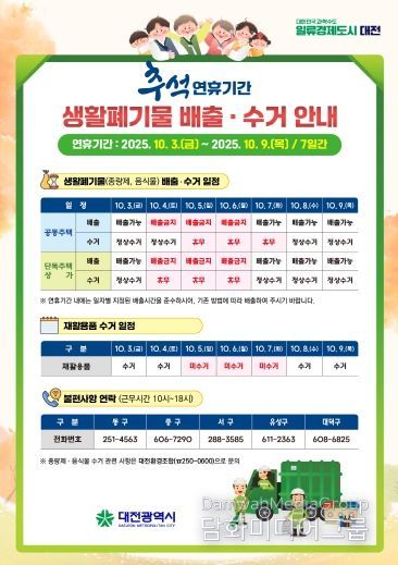 시민행정신문 김학영 기자 | 대전시는 민족 최대 명절인 추석을 맞아 시민들이 쾌적한 환경에서 연휴를 보낼 수 있도록 생활쓰레기 관리대책을 마련해 시행한다고 2일 밝혔다.