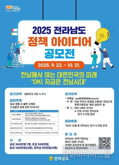 시민행정신문 강갑수 기자 | 전라남도가 새 정부의 실용주의 기조에 맞춰 ‘생활 속 불편을 찾고 이를 개선할, 지역의 미래를 먹여 살릴 정책’을 주제로 ‘2025년 전라남도 정책 아이디어 공모전’을 개최한다.