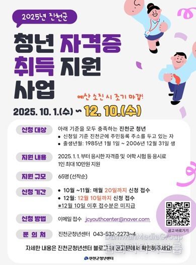 시민행정신문 강갑수 기자 | 충북 진천군 청년센터는 10월부터 청년들의 직무 역량 강화와 진로 설계를 돕고 경제적 부담을 완화하기 위해 ‘청년 자격증 취득 지원사업’을 본격 시행한다고 9일 밝혔다.
