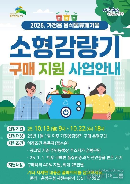 시민행정신문 강갑수 기자 | 서울 은평구는 음식물 제로웨이스트를 실천을 위해 ‘은평구 가정용 소형감량기 구매 2차 지원사업’ 신청자를 오는 13일부터 22일까지 모집한다고 밝혔다.
