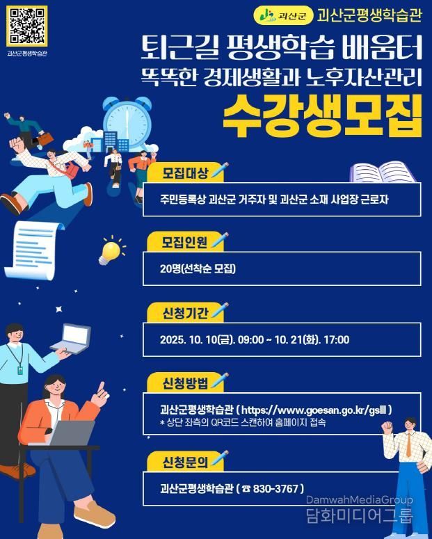 시민행정신문 강갑수 기자 | 충북 괴산군은 10일부터 오는 21일까지 ‘2025년 괴산군 평생학습관 퇴근길 평생학습 배움터’ 수강생을 모집한다고 밝혔다.