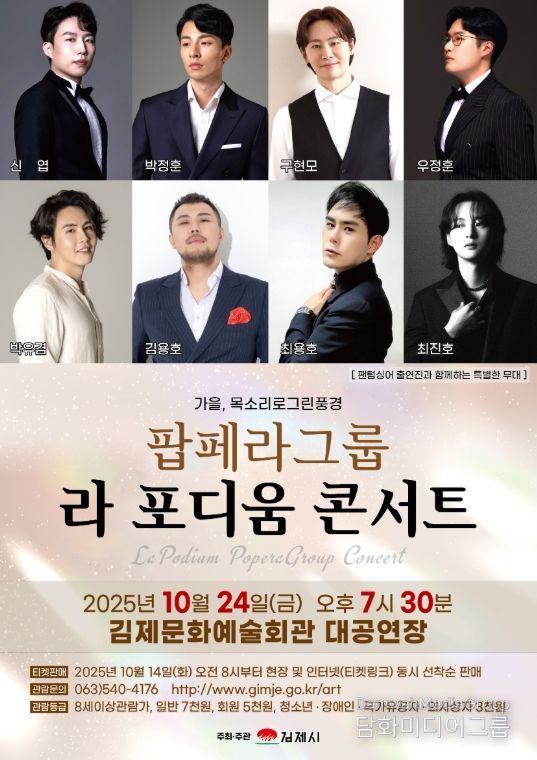 시민행정신문 강갑수 기자 | 깊어 가는 가을, 특별한 음악의 향연 팝페라 그룹'라 포디움 콘서트'가 오는 24일 오후 7시 30분 김제문화예술회관 대공연장에서 펼쳐진다.