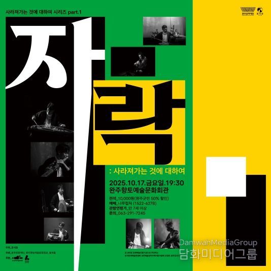 시민행정신문 강갑수 기자 | 전북 완주군에 깊어가는 가을밤, 사라져가는 토속 민요의 숨결을 현대적인 감각으로 재조명하고 재해석한 특별한 국악 공연이 펼쳐진다. 완주문화재단은 오는 10월 17일, 완주향토예술문화회관에서 국악앙상블 불세출의 '자락: 사라져가는 것에 대하여' 공연을 개최한다
