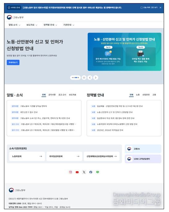 오늘부터는 임시 대표 누리집 서비스를 개시(15시 이후 ~)하여 입법예고 등 공지 사항, 공고 및 고시, 보도자료 등을 확인 할 수 있으며, 고용, 노동, 산업안전분야 정책도 게시판을 통해 편리하게 찾아볼 수 있다.