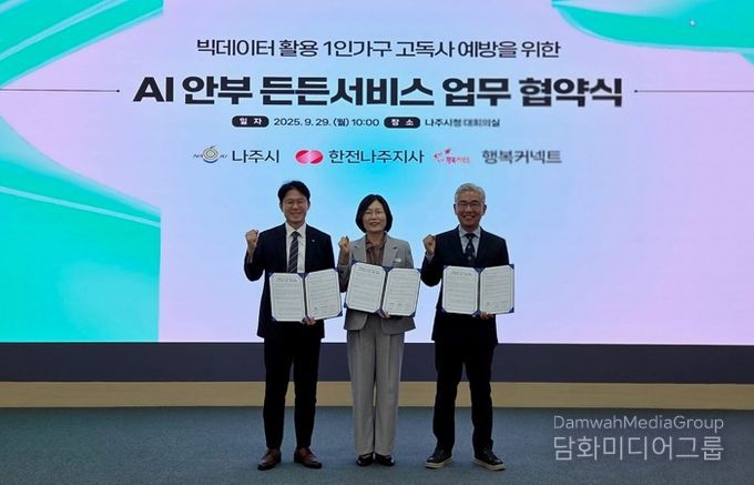 나주시(시장 윤병태)는 최근 한국전력공사 나주지사, SK재단법인 행복커넥트와 함께 1인 가구 사회안전망 강화를 위한 ‘AI안부 든든서비스’ 3자 업무협약을 체결하며 민관공이 함께하는 통합형 사회안전망 구축에 나섰다고 11일 밝혔다.