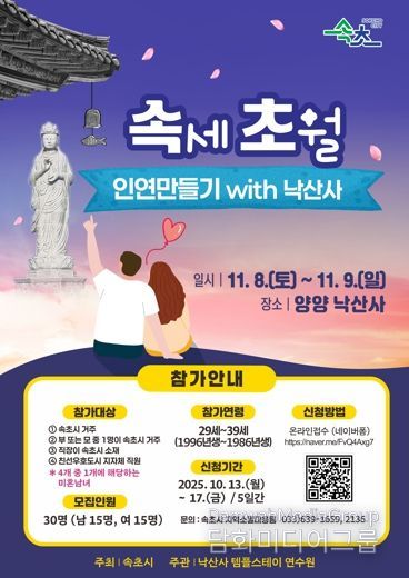 시민행정신문 강갑수 기자 | 속초시는 11월 8일부터 9일까지 양양 낙산사 템플스테이 연수원에서 결혼 적령기 청춘남녀 만남 행사 ‘속세 초월 인연만들기 with 낙산사’를 개최한다.