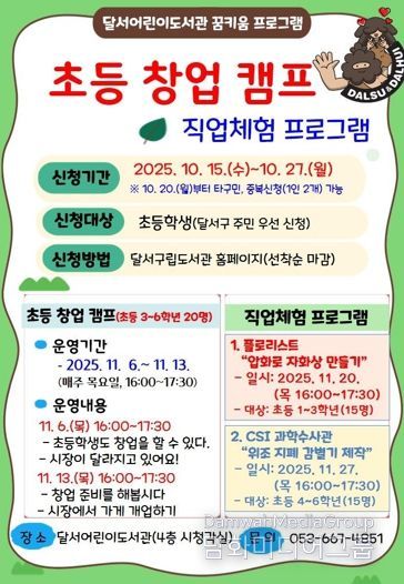 시민행정신문 강갑수 기자 | 대구 달서구는 초등학생들의 창의적 사고력과 진로 탐색 능력을 키우기 위해 오는 11월 ‘꿈 키움 체험 프로그램’을 운영하고, 10월 15일부터 27일까지 참가자를 모집한다.
