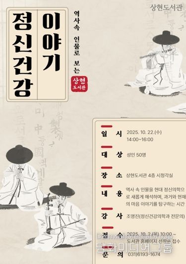 시민행정신문 기자 | 용인시 상현도서관은 오는 22일 오후 2시 ‘정신건강의 날’을 기념해 시민 대상 공개강좌 ‘역사 속 인물로 보는 정신건강 이야기’를 개최한다.