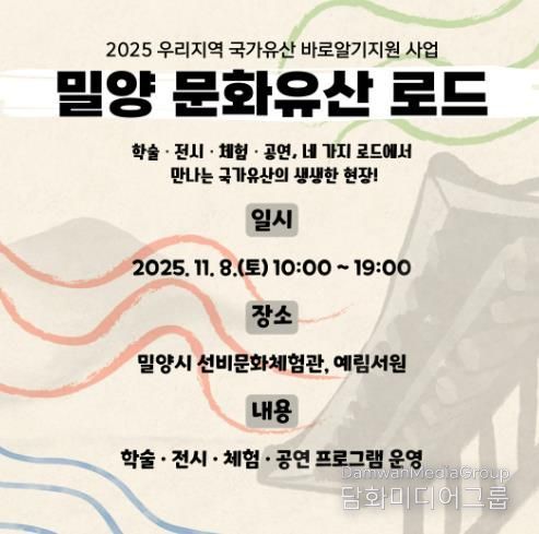 시민행정신문 강갑수 기자 | 밀양문화관광재단은 오는 11월 8일 오전 10시부터 오후 7시까지 예림서원과 선비문화체험관 일원에서 지역 무형유산의 가치를 시민과 함께 나누는 ‘밀양 문화유산 로드’를 개최한다고 13일 밝혔다.