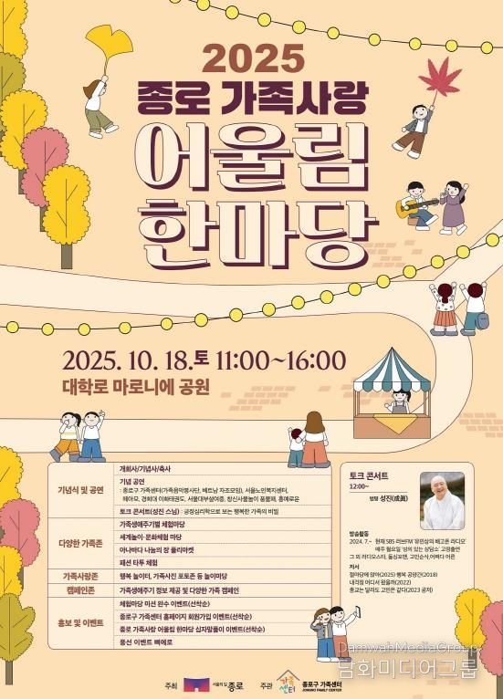 시민행정신문 이존영 기자 | 종로구는 10월 18일 11시부터 16시까지 대학로 마로니에공원에서 '2025 종로 가족사랑 어울림한마당'을 개최한다.