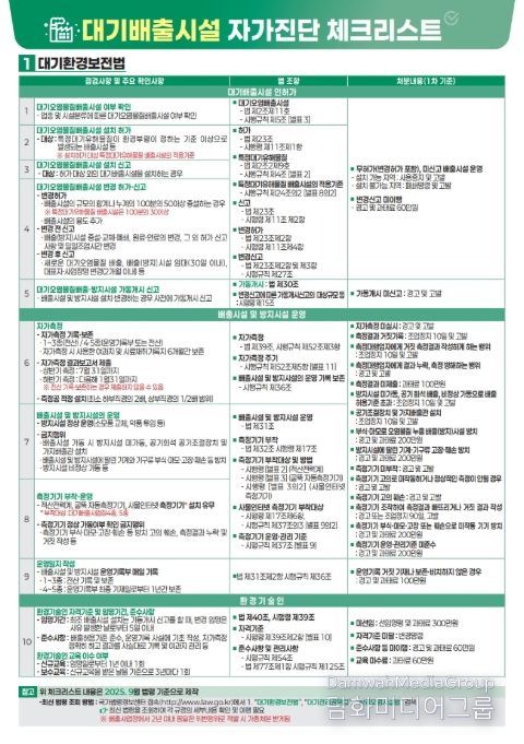 이번에 배포된 점검표는 사업장이 스스로 오염물질 배출시설 및 방지시설 운영 전반을 점검할 수 있도록 구성됐으며 배출시설 허가·신고 사항, 자가측정 이행 여부, 방지시설 정상 가동, 측정기기 부착·운영 상태, 환경기술인 선임 및 교육 이수 여부 등 12개 주요 항목과 세부 점검 사항이 담겨 있다.