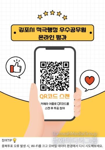 온라인평가 페이지는 김포시청 홈페이지의 ‘적극행정 알림 소식’ 코너를 이용하거나 웹포스터의 큐알코드를 휴대전화로 스캔해 접속할 수 있다.