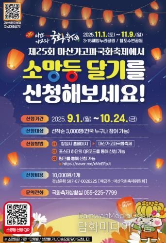 시민행정신문 강갑수 기자 | 창원특례시는 제25회 마산가고파국화축제의 시민 참여 프로그램인 ‘소망등 달기’ 신청기간을 당초 10월 17일에서 10월 24일까지 1주일 연장한다고 밝혔다.