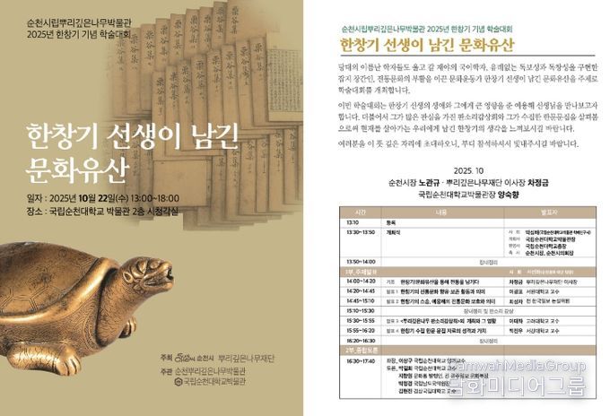시민행정신문 강갑수 기자 | 순천시는 오는 22일 오후 1시 순천대학교박물관 시청각실(2층)에서 ‘한창기 선생이 남긴 문화유산’을 주제로 학술대회를 개최한다.