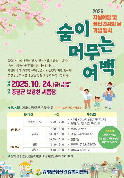 시민행정신문 기자 | 충북 증평군정신건강복지센터가 오는 24일 오후 4시 보강천 씨름장 특설무대에서 자살예방 및 정신건강의 날 행사를 개최한다.