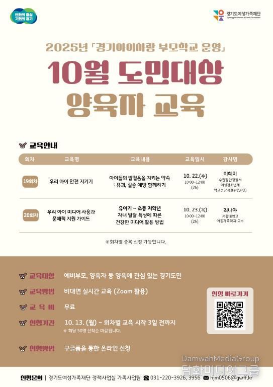 한편 이번 교육은 재단이 경기도 위탁으로 운영하는 ‘2025년 경기아이사랑부모학교’ 사업의 하나로 마련됐다. ‘경기아이사랑부모학교’는 경기도가 건강한 양육 문화 확산을 목표로 도민에게 체계적인 양육자 교육과 1:1 맞춤형 양육상담을 제공하는 사업이다.