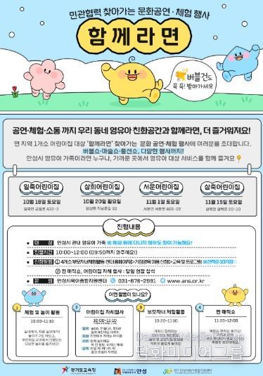 시민행정신문 강갑수 기자 | 안성시육아종합지원센터는 오는 10월 18일부터 11월 15일까지 면지역 어린이집을 거점으로 영유아 가족을 대상으로 한 찾아가는 육아지원 프로그램 ‘함께라면(面)’을 운영한다고 밝혔다.