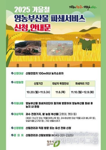 시 관계자는 “신청 접수 후 지원 대상자를 확정하고 11월 10일부터 파쇄 서비스를 진행할 예정”이라며 “산불로부터 안전한 농촌 환경을 만들 수 있도록 많은 농업인의 협조를 바란다”고 밝혔다.