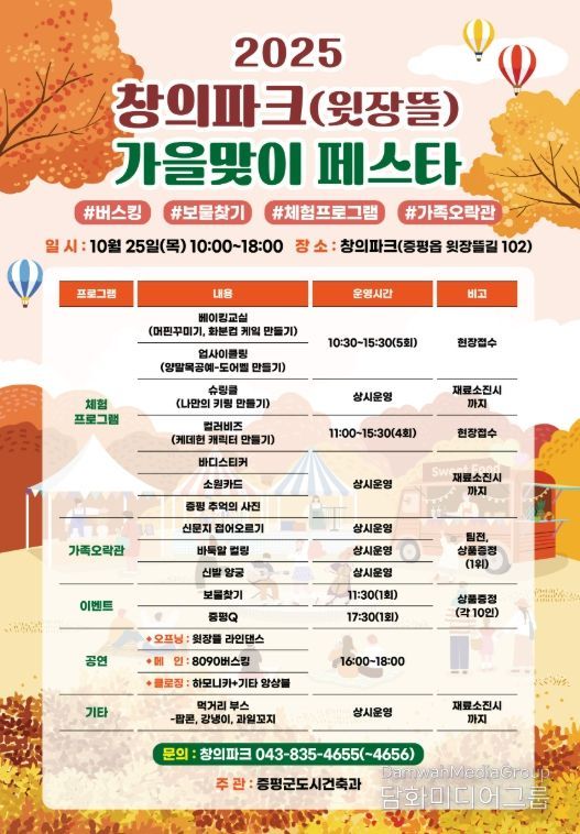 시민행정신문 강갑수 기자 | 충북 증평군이 오는 25일 오전 10시부터 증평 창의파크 일원에서 ‘창의파크 가을맞이 페스타’를 개최한다.