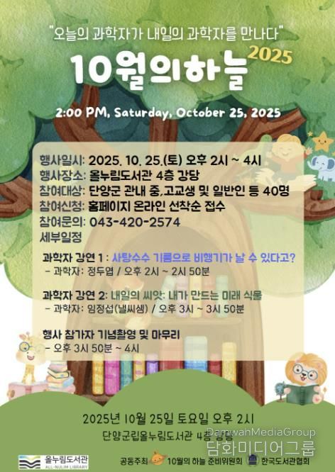 시민행정신문 기자 | 충북 단양군립올누림도서관은 오는 25일 오후 2시부터 4시까지 과학자들의 재능기부로 진행되는 ‘10월의 하늘’ 과학 행사를 운영한다고 밝혔다.